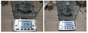 - 重復(fù)剛才的步驟擦拭干剛才測(cè)的2號(hào)陶瓷材料,確保不沾有一點(diǎn)水。把陶瓷材料放在稱重架上,重復(fù)前面兩個(gè)操作步驟。得出以下的測(cè)量結(jié)果。
