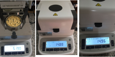 測試樣品2:為了檢測儀器的精確性,待儀器溫度降至50℃以下時進行第二次測試,用實驗勺提取5.5克飼料,置于不銹鋼托盤中,用實驗藥勺將飼料平鋪均勻,溫度設置135℃用儀器進行加熱,約15分鐘后檢測結束,檢測數據顯示14.88%;