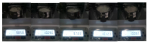- 將防風(fēng)盤、支架、樣品盤一一裝好,接通電源,按下開(kāi)機(jī)鍵,顯示屏進(jìn)入開(kāi)機(jī)界面,首先按去皮鍵減去樣品盤重量,后將100g砝碼放入托盤進(jìn)行校準(zhǔn);