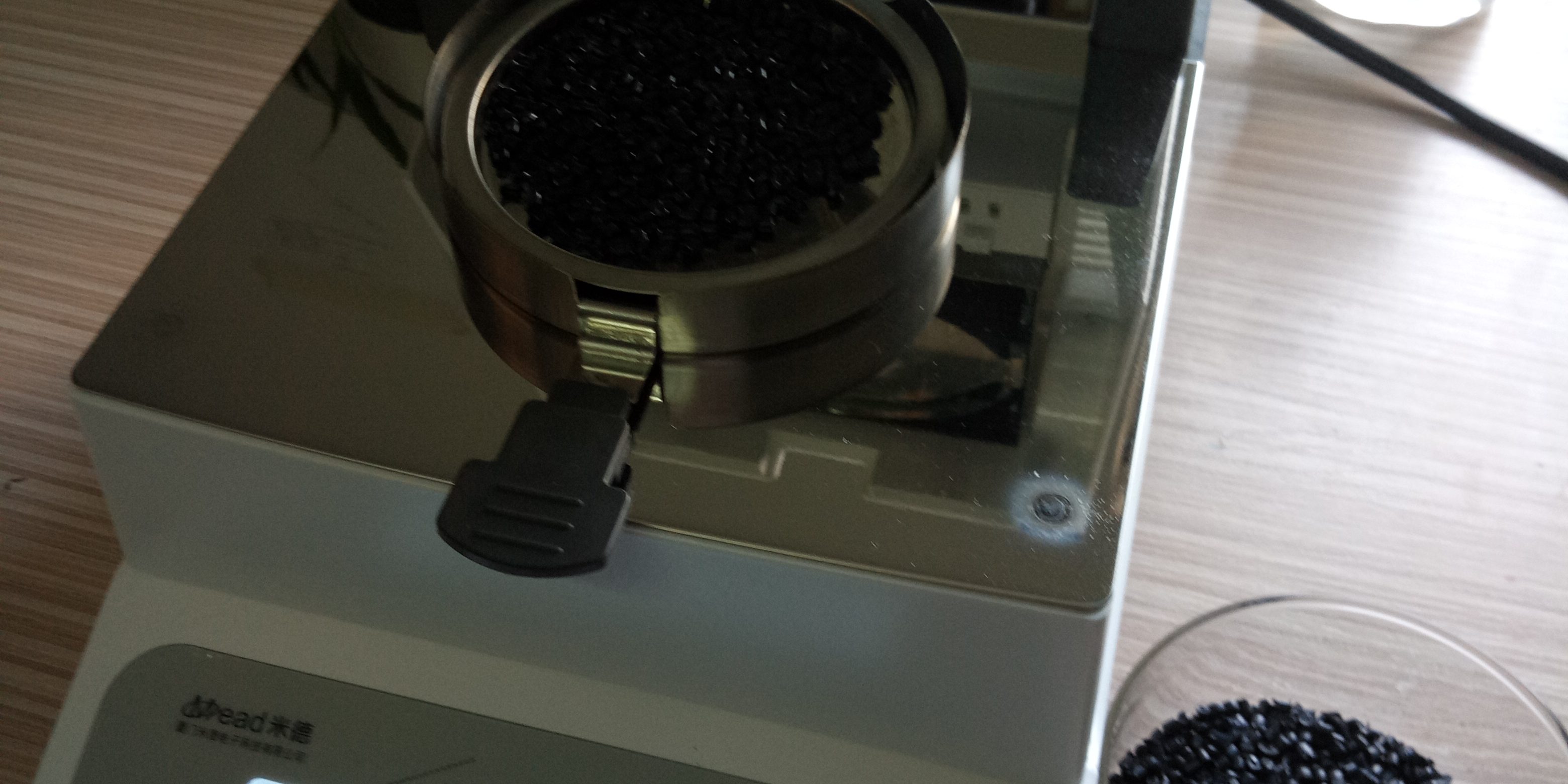 - 測試再生尼龍顆粒:倒出8克左右再生尼龍料顆粒倒在不銹鋼托盤中,為了使測試過程中再生尼龍水分儀將再生尼龍料烘干烘透,我們將尼龍顆粒攤成分散狀,以便溫度能滲透進再生尼龍內(nèi)部。用鑷子將再生尼龍顆粒平鋪均勻,為避免尼龍顆粒烘烤后變焦變黑,我們將溫度設(shè)置在125℃,按“START”鍵開始測試,5分40秒后檢測結(jié)束,檢測數(shù)據(jù)顯示0.67%;