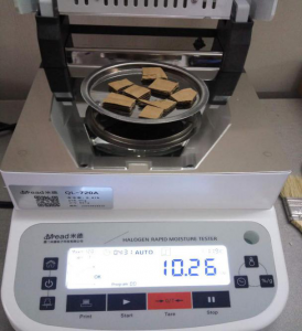 再次測(cè)試同樣撕取2克紙皮均勻平鋪在托盤(pán)中,5分鐘左右檢測(cè)結(jié)束結(jié)果顯示10.74%。