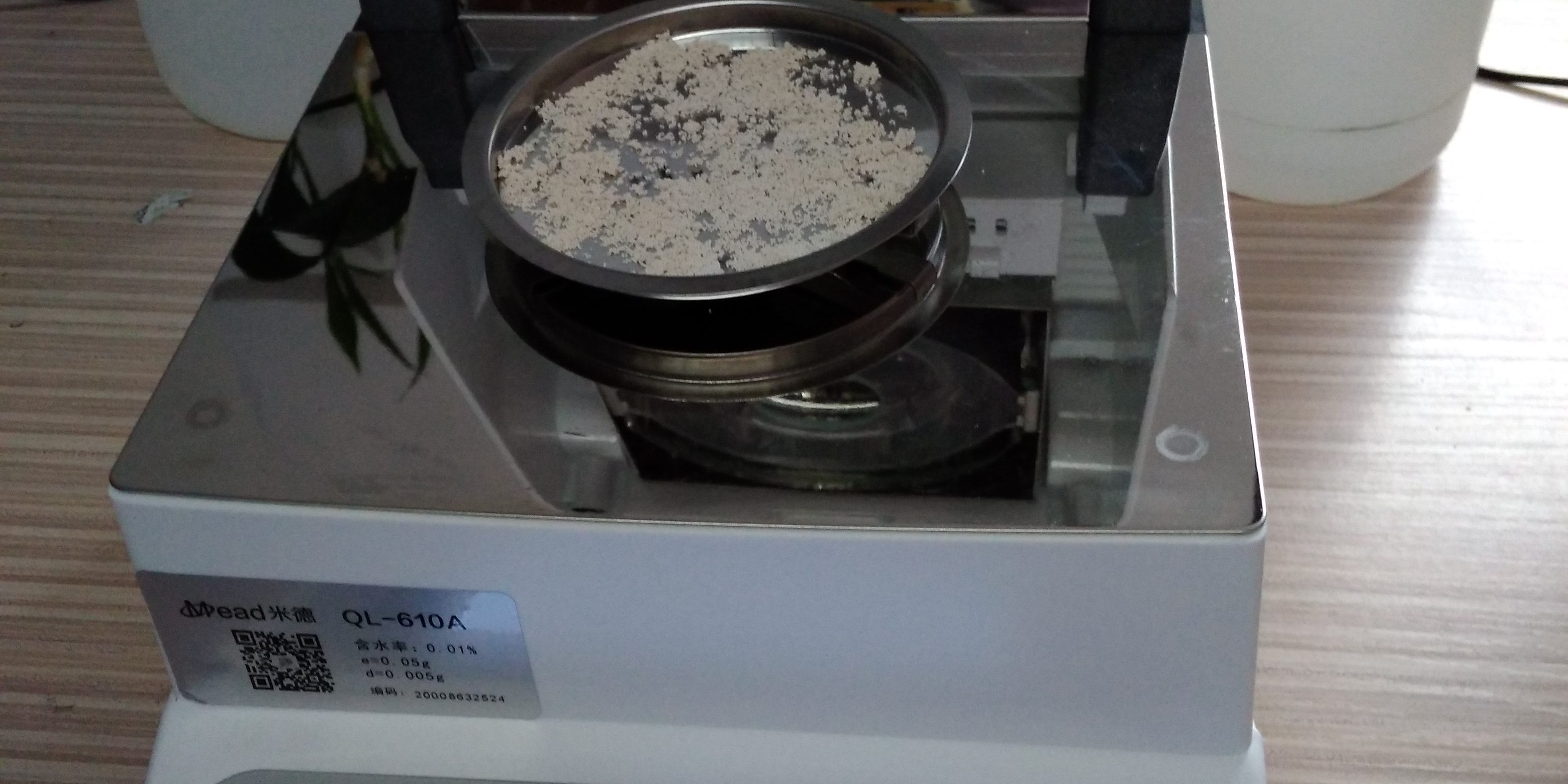• 測試樹脂顆粒:倒出4克左右樹脂料顆粒倒在不銹鋼托盤中,為了使測試過程中樹脂水分儀將樹脂料烘干烘透,我們將樹脂顆粒攤成分散狀,以便溫度能滲透進樹脂內(nèi)部。用鑷子將樹脂顆粒平鋪均勻,為避免樹脂顆粒烘烤后變焦變黑,我們將溫度設(shè)置在105℃,按“START”鍵開始測試,15分07秒后檢測結(jié)束,檢測數(shù)據(jù)顯示56.57%;